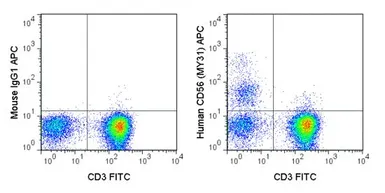 The MY31 antibody reacts with human CD56, also known as the neural cell adhesion molecule (NCAM), a glycoprotein which is a member of the immunoglobulin superfamily. The 140 kDa isoform of CD56 is expressed on human NK cells and NK-T cells, with increased expression levels on activated NK lymphocytes. The CD56 antigen is also expressed by neurons and is reported to play a role in nervous system development and neural cell-to-cell adhesion. Clone MY31 also reacts with a subset of CD14+ monocytes in non-human primates, and is reported to be cross-reactive with Chimpanzee, Cynomolgus and Rhesus.