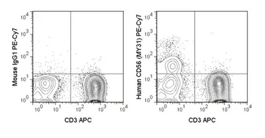 Right panel : co-stained with NCAM antibody [MY31] (PE-Cy7) and Human CD3 antibody (APC)