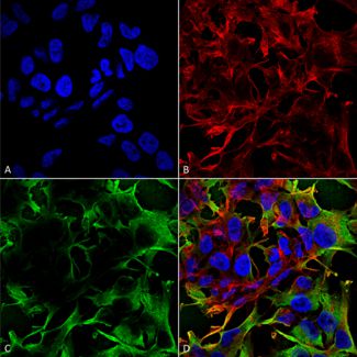 Immunocytochemical staining of SK-N-BE with Nlgn3 monoclonal antibody, clone S110-29 (RPE) (Cat # MAB18690). (A) DAPI (blue) nuclear stain (B) Phalloidin Texas Red F-Actin stain (C) Nlgn3 Antibody and (D) Composite.Western Blot (Tissue lysate)