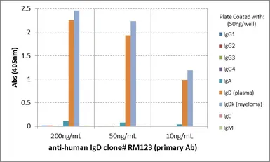 ELISA analysis of human immunoglobulins (50 ng/well) using GTX60868 Human IgD antibody [RM123]. No cross reactivity with human IgG, IgM, IgA, or IgE.