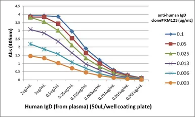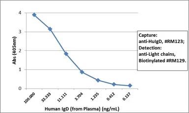 Sandwich ELISA analysis of human IgD using GTX60868 Human IgD antibody [RM123] as the capture antibody (100ng/well) and GTX60920 Human Ig Light Chains antibody [RM129] (Biotin) as the detection antibody.