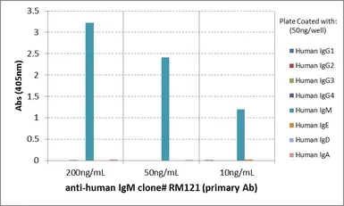 ELISA analysis of human immunoglobulins (50 ng/well) using serial diluted GTX60866 Human IgM antibody [RM121]. No cross reactivity with Human IgG, IgE, IgD, or IgA.