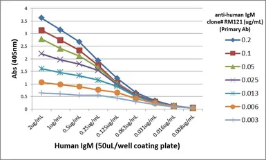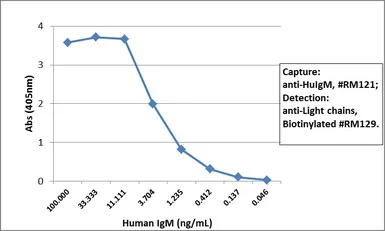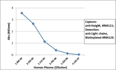Sandwich ELISA analysis of human IgM using GTX60866 Human IgM antibody [RM121] as the capture antibody (100ng/well) and GTX60920 Human Ig Light Chains antibody [RM129] (Biotin) as the detection antibody.