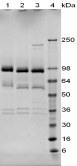 1D SDS-PAGE of Symansis' hcx protein before and after treatment with glycosidases to remove oligosaccharides. A drop in the observed MW after treatment indicates the presence of glycosylation.