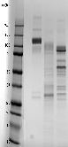 | Symansis' M-CSF R - Fchcx Chimera has N-linked and O-linked oligosaccharides, shown by a drop in observed MW on SDS-PAGE after treatment with PNGase F and a further drop after treatement with a glycosidase cocktail. Symansis' M-CSF R - Fchcx Chimera contains 20-45% carbohydrate by weight. Densitometry of protein isoforms visualised by 2-DE. Spot trains are normal in human proteins and highlight the presence of multiple isoforms which differ according to their level of post-translational modification. The triangle indicates the theoretical MW and pI of the protein. 1D SDS-PAGE of Symansis' hcx protein before and after treatment with glycosidases to remove oligosaccharides. A drop in the observed MW after treatment indicates the presence of glycosylation. 1. Bourette and Rohrschneider (2000) Growth Factors 17:155-166 | ![]() | ![]() |