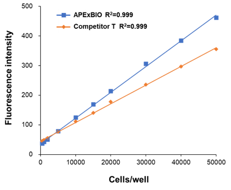 This kit has a wide range of applicability for the proliferation assay of animal cells, plants, bacteria, and fungi. Compared with MTT, WST-1, CCK-8 and other methods, this kit has higher sensitivity, and can detect as low as 50-100 cells per well when using fluorescence. Moreover, this kit is a ready-to-use reagent that is suitable for high-throughput screening. In addition, this reagent is non-toxic and does not affect cell health. For 96-well plates, 5 mL of this reagent is supplied for 500 assays; 25 mL is supplied for 2500 assays; and 100 mL is supplied for 10000 assays.