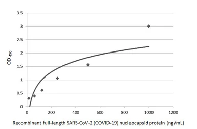 Sandwich ELISA detection of recombinant full-length SARS-CoV-2 (COVID-19) nucleocapsid protein, His tag protein (GTX135592-pro) using SARS-CoV-2 (COVID-19) nucleocapsid antibody [HL5511] (GTX635689) as capture antibody at concentration of 5 μg/mL and HRP-conjugated SARS-CoV-2 (COVID-19) nucleocapsid antibody [HL249] (GTX635678) as detection antibody at concentration of 1 μg/mL.