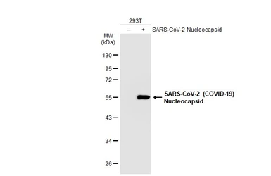 Non-transfected (–) and transfected (+) 293T whole cell extracts (30 μg) were separated by 10% SDS-PAGE, and the membrane was blotted with SARS-CoV-2 (COVID-19) nucleocapsid antibody [HL249] (GTX635678) diluted at 1:5000. The HRP-conjugated anti-rabbit IgG antibody (GTX213110-01) was used to detect the primary antibody.