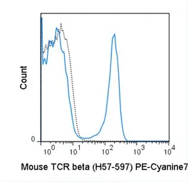 The H57-597 antibody is specific for the beta chain of the mouse T cell Receptor (TCR). This cell surface protein combines with a second protein chain (alpha chain) to form the alpha-beta TCR that is expressed by NK1.1+ thymocytes, NKT cells, and the majority of peripheral T cells. A small number of T cells may express an alternative heteromer of gamma/delta protein chains, known as the g/d TCR. These receptors participate in a complex with CD3, and with the co-receptors CD4 or CD8, to recognize and respond to antigens bound to MHC molecules on antigen-presenting cells. Such interactions promote T cell receptor signaling (T cell activation) and can result in a number of cellular responses including proliferation, differentiation, production of cytokines or activation-induced cell death. The H57-597 antibody is used as a phenotypic marker for T cells expressing the alpha-beta TCR. It is also widely used to cross-link surface TCR and thereby mimic TCR-mediated cell activation or induction of apoptosis. The antibody does not cross-react with cells expressing the g/d TCR.