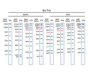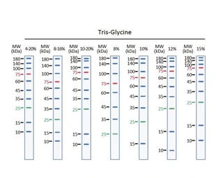 The GTX49384 Trident Prestained Protein Ladder (Standard Range) is a ready-to-use three-color protein standard with 10 pre-stained proteins covering a wide range of molecular weights from 10 to 180 kDa in Tris-Glycine Buffer (9 to 170 kDa in Bis-Tris (MOPS) buffer and 10 to 180 kDa Bis-Tris (MES) buffer). Proteins are covalently coupled with a blue chromophore except for two reference bands (one green and one red band at 25 kDa and 75 kDa respectively) when separated on SDS-PAGE (Tris-Glycine buffer). GTX49384 Trident Prestained Protein Ladder is designed for monitoring protein separation during SDS-polyacrylamide gel electrophoresis, verification of Western transfer efficiency on membranes (PVDF, nylon, or nitrocellulose) and for approximating the size of proteins.