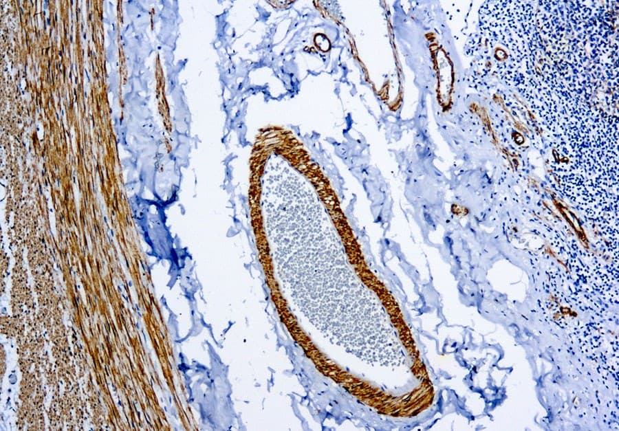 - Rendimiento óptimo cuando se usa como parte de un panel multiparamétrico de anticuerpos que incluye desmina, h-caldesmón, actina de músculo liso y calponina
