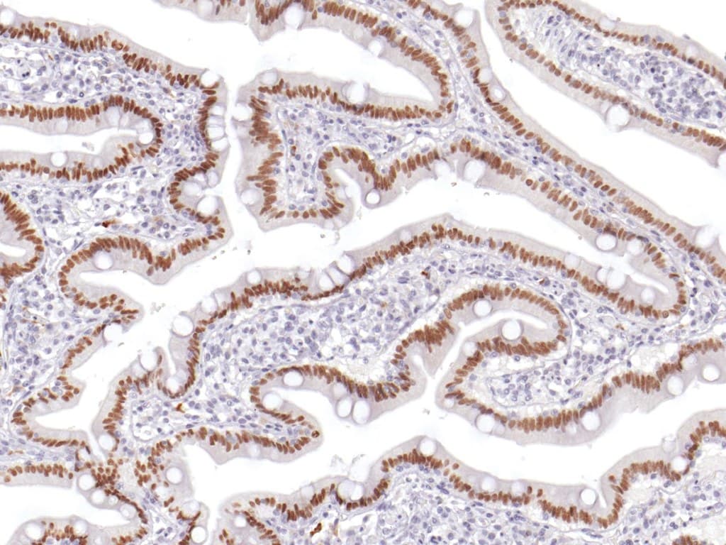 En el epitelio intestinal adulto, CDX-2 regula procesos biológicos clave que incluyen la proliferación, diferenciación, adhesión y apoptosis de las células epiteliales, apoyando la renovación tisular y la integridad estructural. Una fuerte expresión nuclear de CDX-2 es una característica distintiva de las células epiteliales intestinales maduras y se conserva en la mayoría de los adenomas colorrectales y adenocarcinomas colorrectales bien diferenciados, lo que refleja su papel como regulador maestro del fenotipo intestinal.