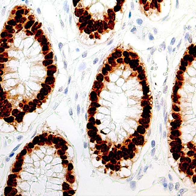 Los anticuerpos anti-CDX-2 validados para inmunohistoquímica permiten una detección fiable de la proteína CDX-2 nuclear en secciones de tejido fijadas en formalina y embebidas en parafina. Estos anticuerpos producen patrones de tinción nuclear reproducibles consistentes con la función biológica de CDX-2 como factor de transcripción. Las características clave incluyen: