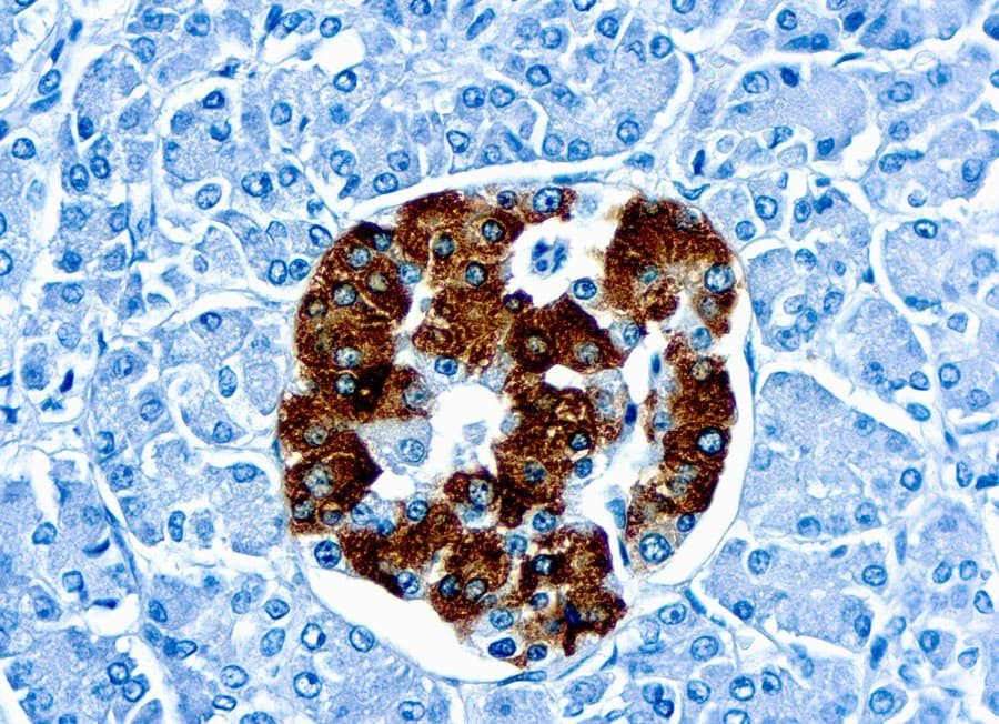 Las células β pancreáticas son la fuente primaria de insulina bajo fisiología normal. La insulina también puede ser producida por tumores neuroendocrinos pancreáticos funcionantes (PanNETs), como los insulinomas. La IHC utilizando anticuerpos anti-insulina resalta la expresión de insulina dentro de estas células tumorales, ayudando en su identificación y caracterización funcional. Estudios comparativos de IHC han demostrado que los insulinomas presentan frecuentemente una fuerte inmunorreactividad a la insulina, subrayando la utilidad de la hormona como marcador específico de tumor cuando se correlaciona con hallazgos clínicos y bioquímicos.