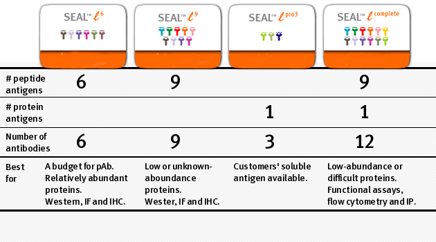 Com base nos resultados da aplicação de mais de 100 bibliotecas SEAL™ geradas para proteínas de membrana, factores solúveis, factores de transcrição e cinases, em média, são descobertos pelo menos 2 vezes mais anticorpos bem sucedidos para experiências Western e IP a partir de anticorpos SEAL™ do que a partir de anticorpos gerados por métodos convencionais. Para alvos difíceis, como receptores de membrana e factores de transcrição, os anticorpos SEAL™ têm 3-4 vezes mais probabilidades de serem bem sucedidos. Isto não é surpreendente, uma vez que o número de anticorpos independentes e epítopos visados é várias vezes superior nos anticorpos SEAL? e para proteínas de baixa abundância, este parece ser um fator ainda mais crítico para a geração de anticorpos bem sucedidos. A geração de bibliotecas de anticorpos SEAL? tem vantagens significativas em relação à geração tradicional de anticorpos monoclonais e policlonais em termos de tempo, custo e, mais importante, qualidade dos anticorpos..